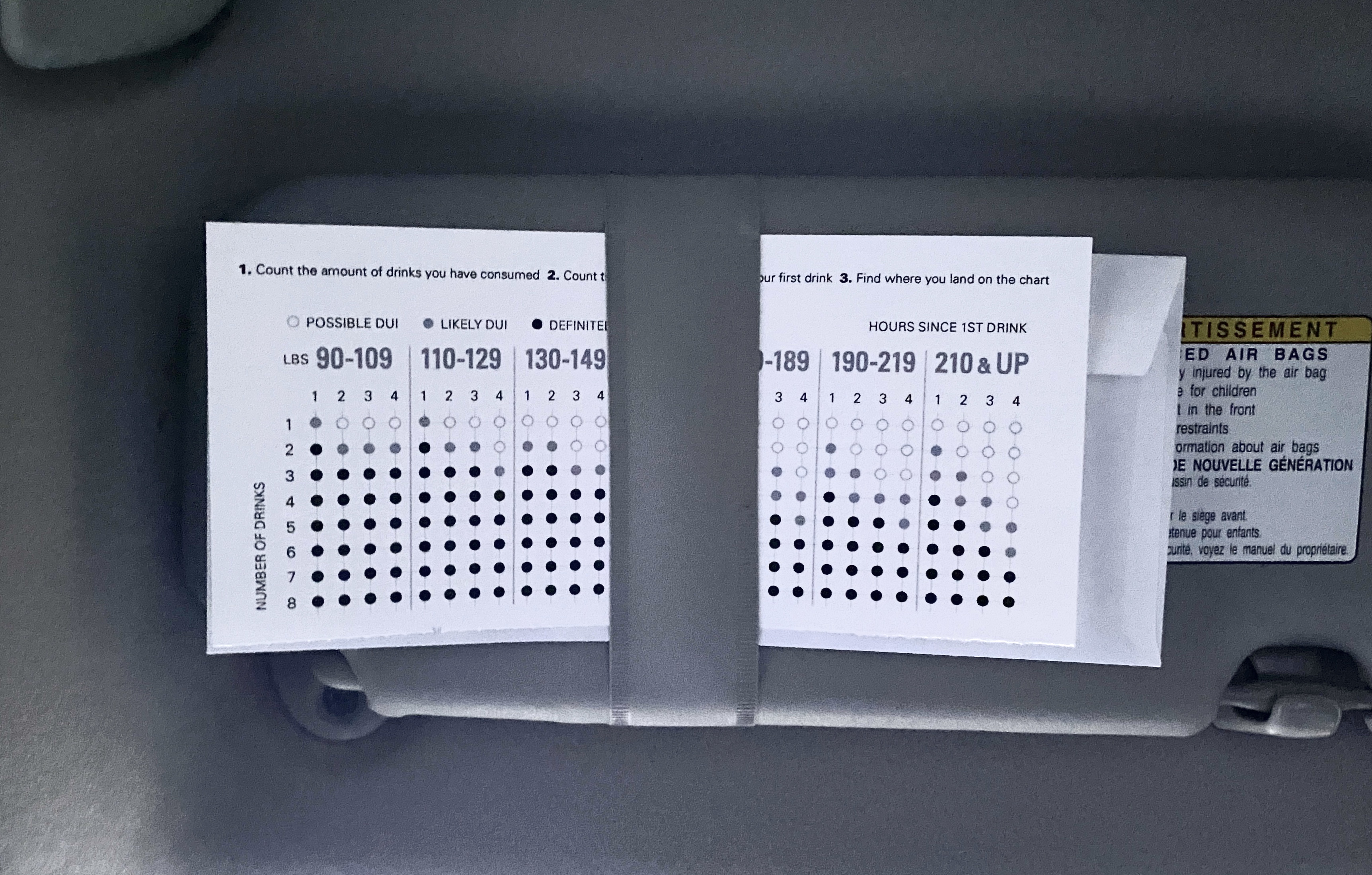 Knowing that I myself would throw away a random PSA sent from the DMV, I wanted this chart to be interactive and actually a product instead. Based on each weight group, I created their own separate chart—wallet sized! Double sided, of course, with instructions on how to read the chart. The recipient could then take their own chart with them out to the bars, and share the other cards with their family and friends of different builds. An overall chart can stored in the car.
